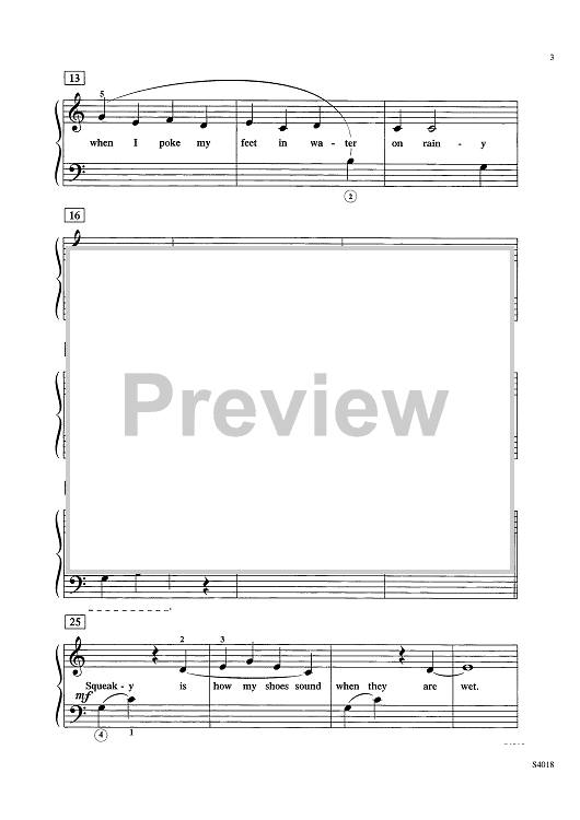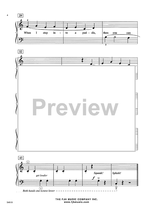 Children love stepping into puddles and students will love the musical effect of squeaky sneakers in this piece. The Middle C melody moves mostly by 2nds, 3rds, and 4ths.