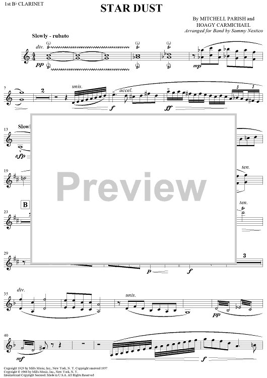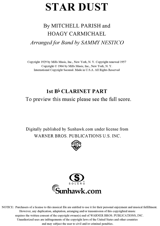 Digital Sheet Music for Star Dust - Clarinet 1 by Mitchell Parish, Hoagy Carmichael, Sammy Nestico scored for Concert Band; id:254183