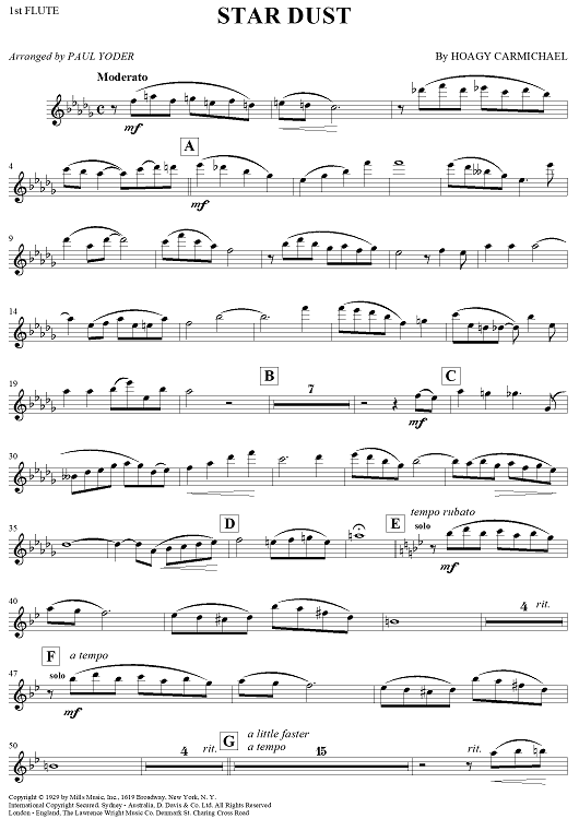 Digital Sheet Music for Star Dust - Flute 1 by Hoagy Carmichael, Paul Yoder scored for Concert Band; id:272935