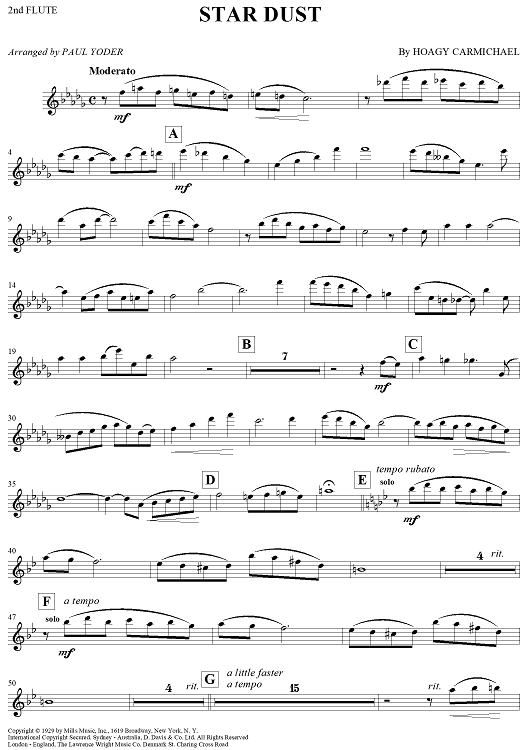 Digital Sheet Music for Star Dust - Flute 2 by Hoagy Carmichael, Paul Yoder scored for Concert Band; id:272925