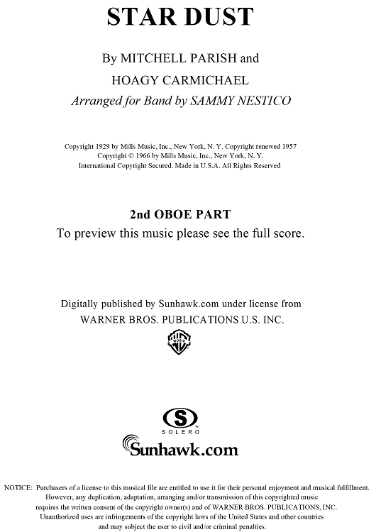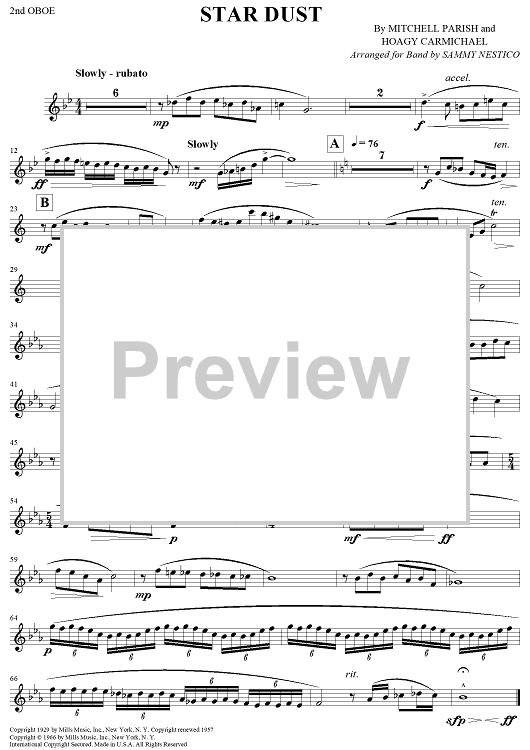 Digital Sheet Music for Star Dust - Oboe 2 by Mitchell Parish, Hoagy Carmichael, Sammy Nestico scored for Concert Band; id:254167