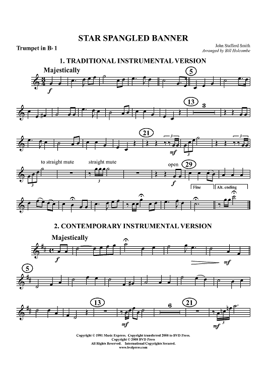 Digital Sheet Music for Star Spangled Banner - Trumpet 1 by John Stafford Smith, Bill Holcombe scored for Brass Quintet; id:405065