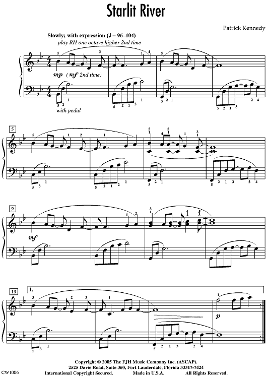 This expressive piece features easy syncopations that give the melody a pensive mood. Arpeggiated chords in the left hand spanning 10th intervals paint the broad, flowing river. Scales, thirds and chords add a richer texture, as the piece develops and arrives. Teachers may wish to use this one as preparation for Romantic piano literature!