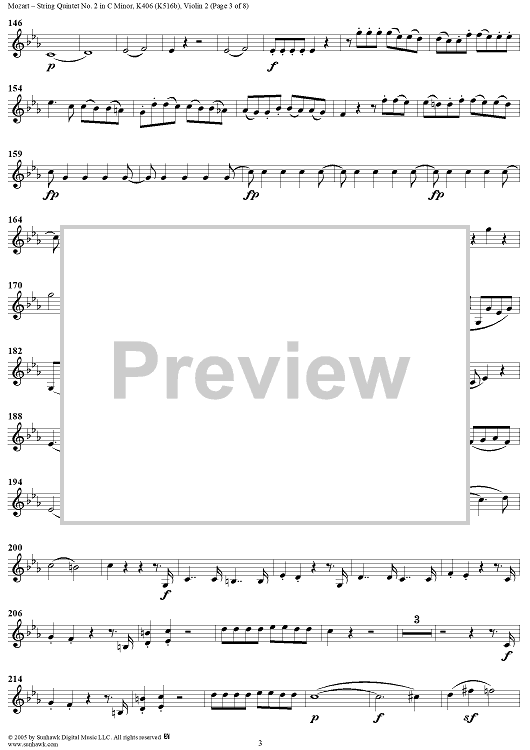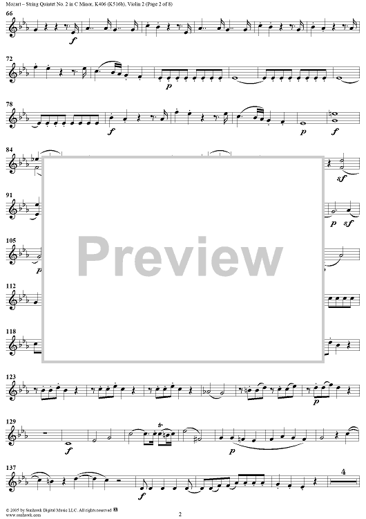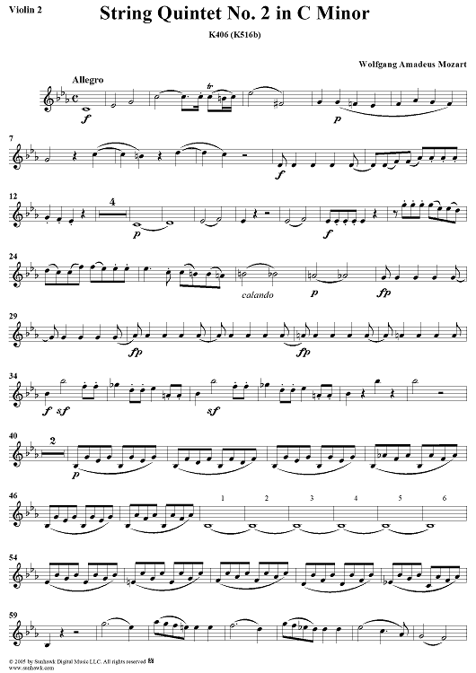 "String Quintet No. 2 in C Minor, K406 - Violin 2" Sheet Music by Wolfgang Amadeus Mozart