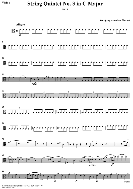 "String Quintet No. 3 in C Major, K515 - Viola 1" Sheet Music by Wolfgang Amadeus Mozart