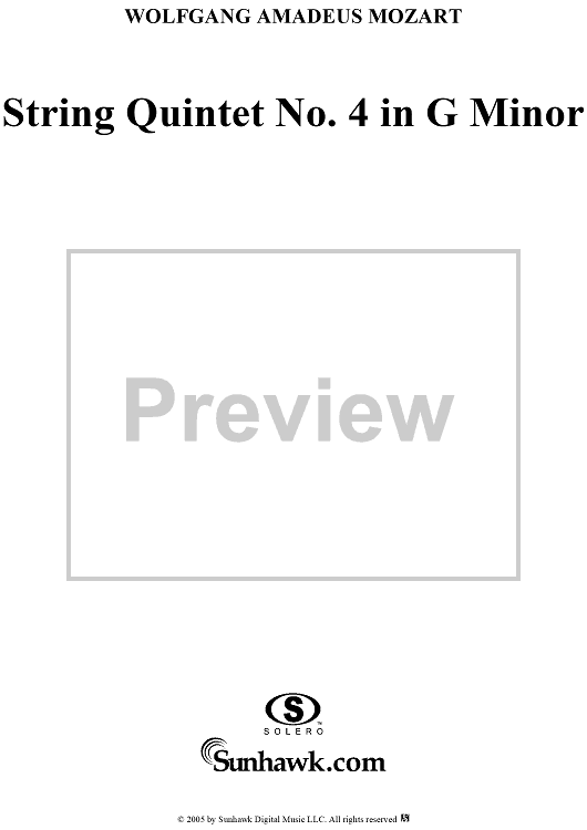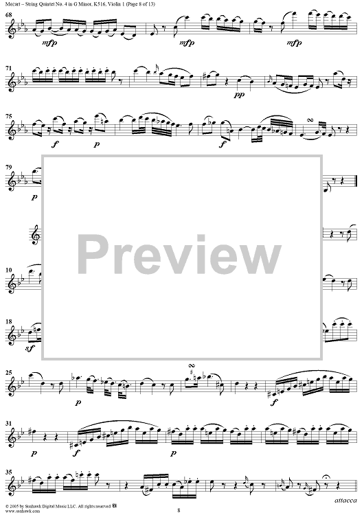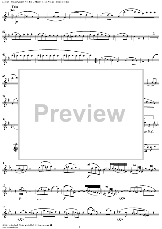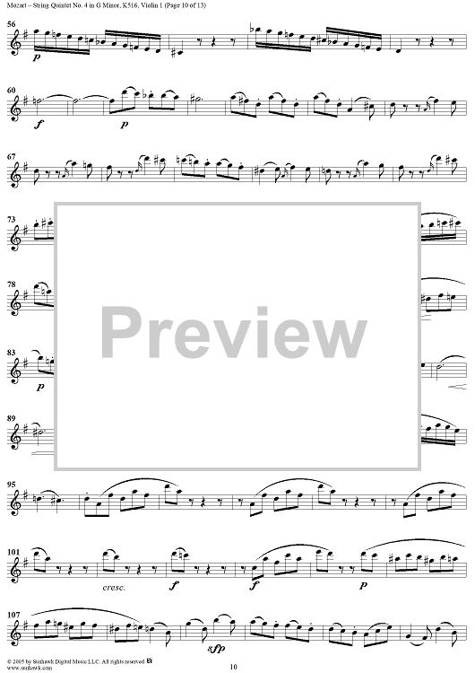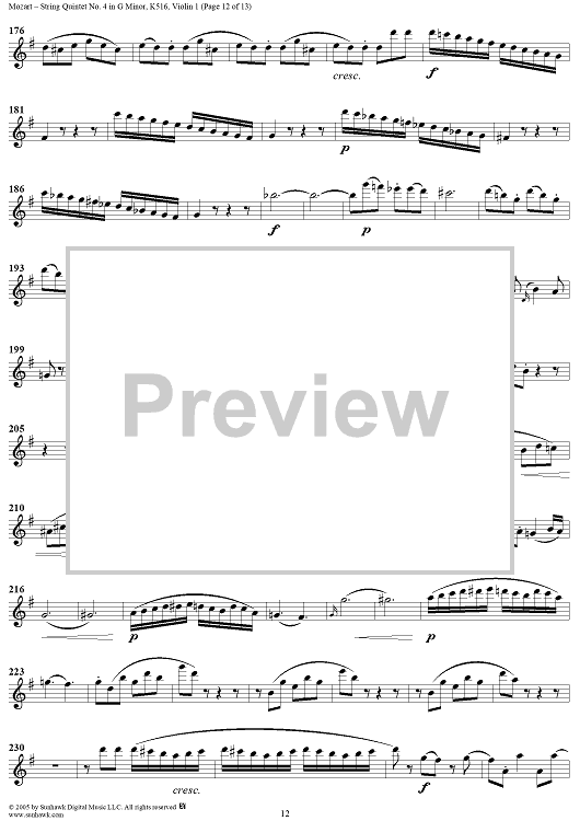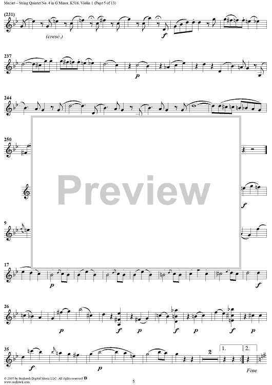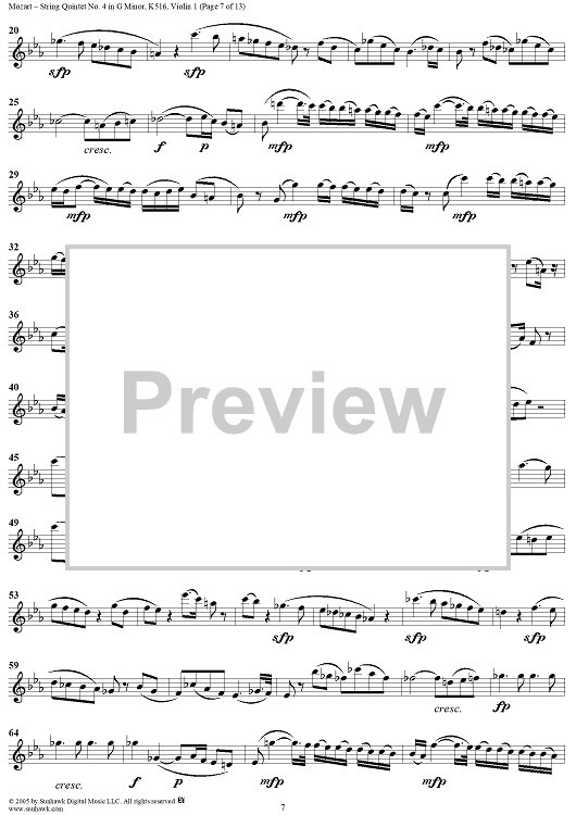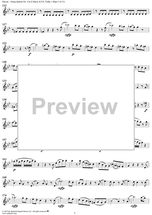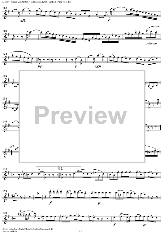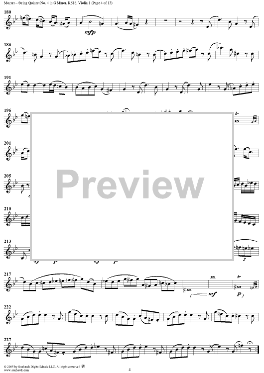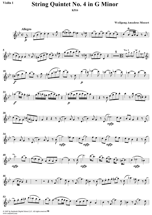 Digital Sheet Music for String Quintet No. 4 in G Minor, K516 - Violin 1 by Wolfgang Amadeus Mozart scored for String Quintet; id:309292