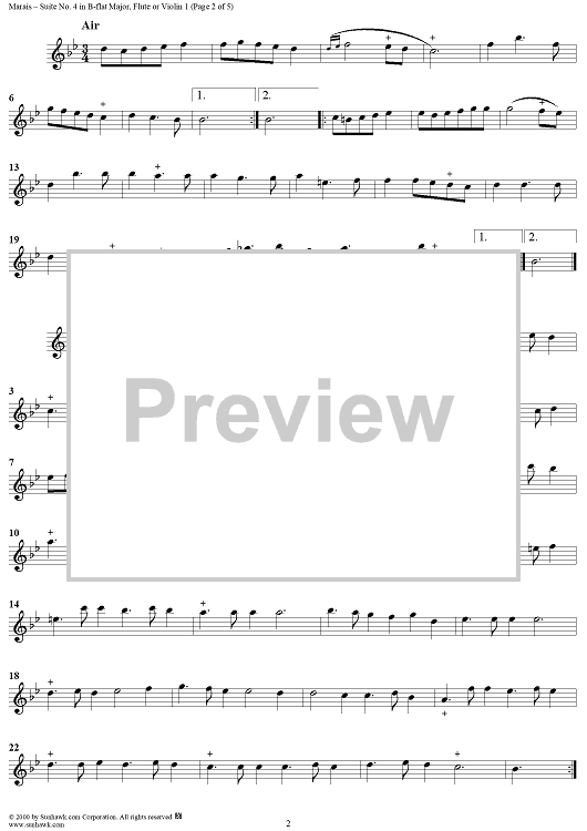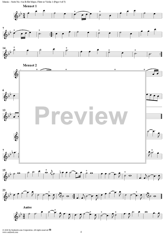 Digital Sheet Music for Suite No. 4 in B-flat Major - Flute 1/Violin 1 by Marin Marais scored for 2 Flutes or 2 Violins, Continuo; id:220682