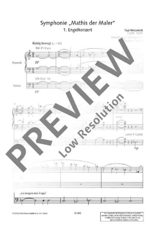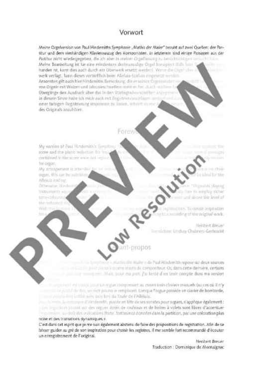 The opulent music of this masterpiece by Paul Hindemith is perfectly suitable for an organ version. Although the organ is one of the few instruments never played by Hindemith, the three sonatas and two organ concertos created by the composer are important pieces for the organ. The transcription of the symphony 'Mathis der Maler' by Heribert Breuer is an effective challenge for ambitious organ players which gives the performer the opportunity to show his skills and make full use of the tonal qualities of his instrument.