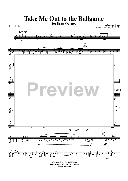 Digital Sheet Music for Take Me Out to the Ballgame - Horn in F by Albert von Tilzer, Roger McDuffie scored for Brass Quintet; id:428066