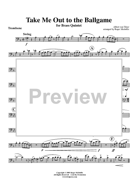 Digital Sheet Music for Take Me Out to the Ballgame - Trombone by Albert von Tilzer, Roger McDuffie scored for Brass Quintet; id:428067