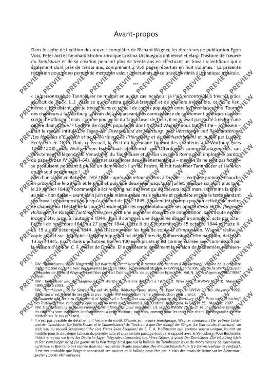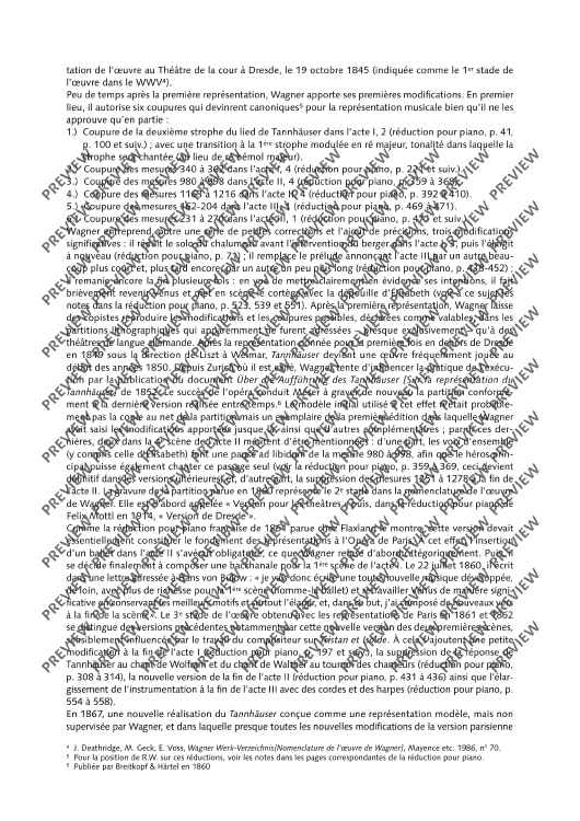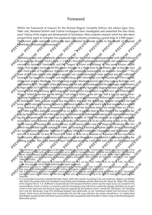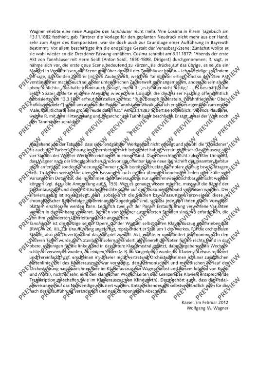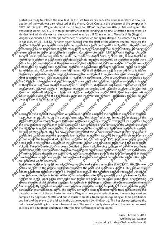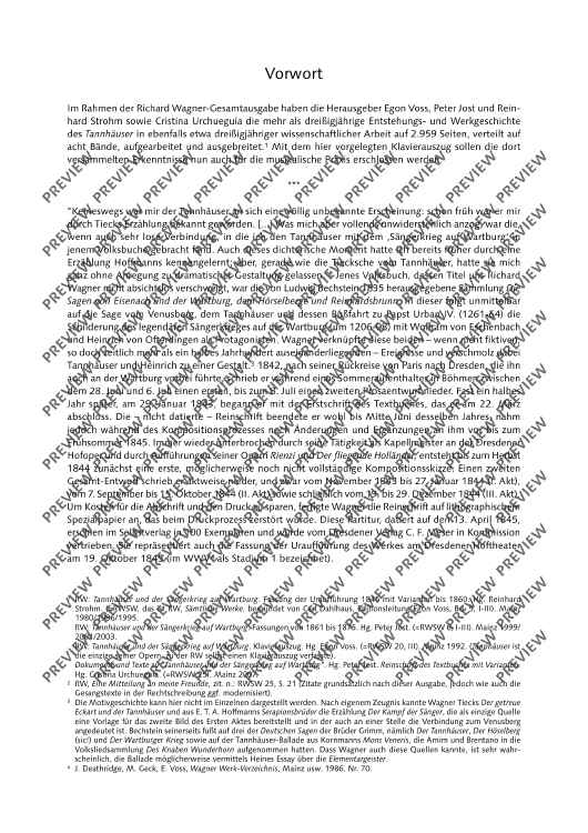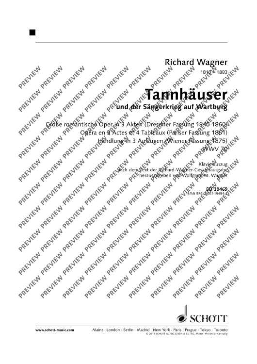 An important addition to Schott's newly published orchestral material is the first publication of piano scores for the ten major operas by Richard Wagner in all major versions. For the first time, we offer the stages and interested opera lovers piano scores as urtext editions that were designed according to uniform editorial criteria.•The score is aligned with the performance material of the Complete Edition. •All piano scores have study numbers and continuous measure numbers for rehearsal and study practice. •The editors are renowned musicologists from the circles of those working on the Richard Wagner Complete Edition who contribute detailed information on the respective editions to the critical prefaces.•The prefaces are printed in three languages (German, English, French). •The uniform appealing cover design with reproductions of paintings from the Wagner era emphasizes the serial character of the edition.TANNHÄUSER"For the Richard Wagner Complete Edition, the editors Egon Voss, Peter Jost and Reinhard Strohm as well as Cristina Urchueguía have researched and presented Tannhäuser's genesis and history of more than thirty years, which also took about thirty years of scientific work, on 2,959 pages in eight volumes. With the present piano score, the findings gathered therein shall now also to be made accessible for the musical practice." (Wolfgang M. Wagner, quoted from the foreword to the new Tannhäuser piano score)The piano score unites for the first time all four stages of the work (the score as of 1845, the score as of 1860, the Paris version as of 1861/62 with the complete French text of this version, and the Vienna version as of 1875) in a single excerpt for rehearsal and study practice, thus allowing the comparison of the versions, without sacrificing practicability.All variants are printed one after the other in the chronological sequence of the action on the stage, so that each of them can be explored in their context of action by simply turning over the
