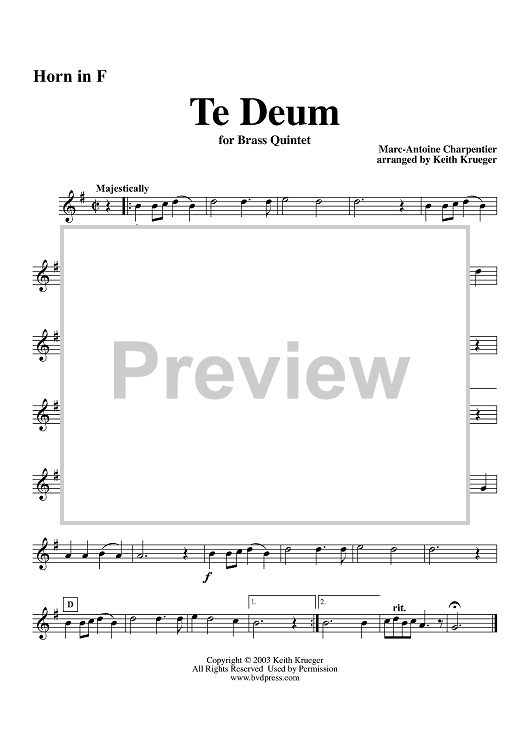 Digital Sheet Music for Te Deum - Horn in F by Keith Krueger, Marc-Antoine Charpentier scored for Brass Quintet; id:315041