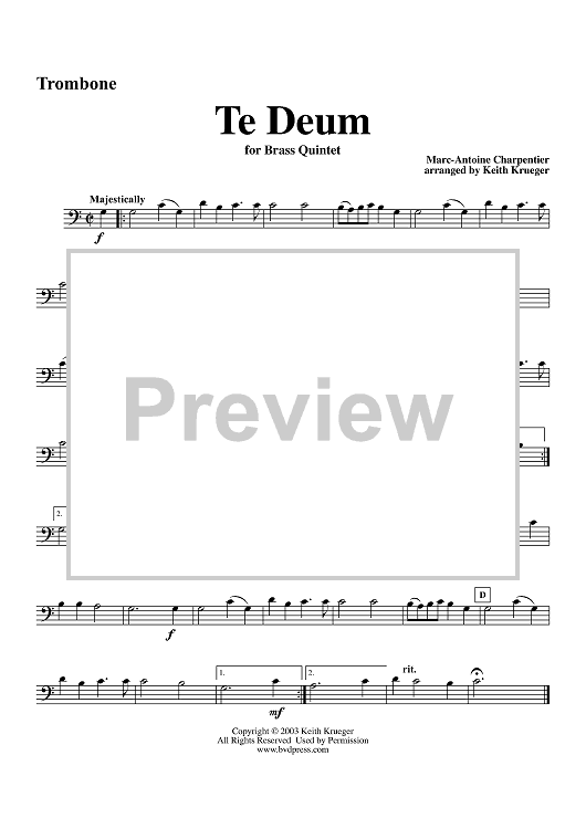 Digital Sheet Music for Te Deum - Trombone by Keith Krueger, Marc-Antoine Charpentier scored for Brass Quintet; id:315042