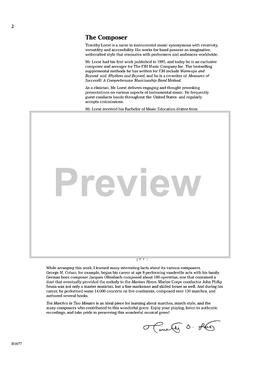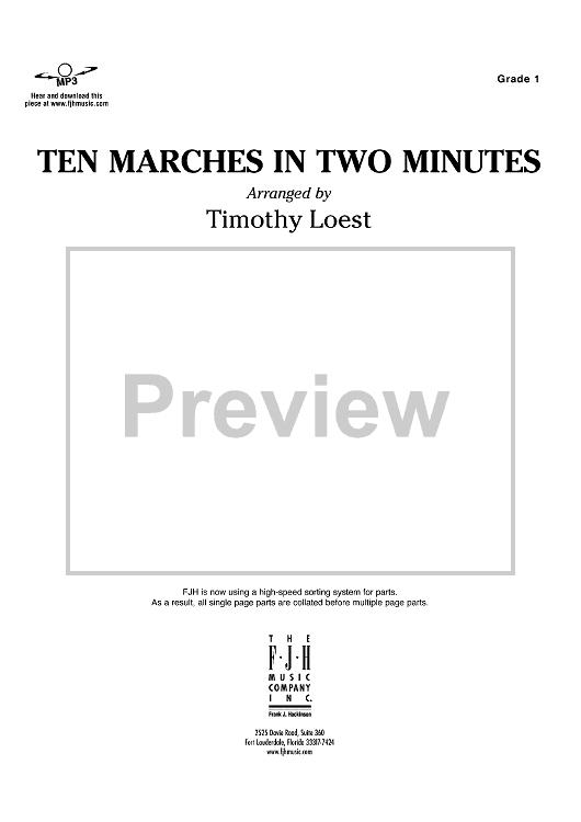 Here's a masterful medley of memorable marches to the power of ten! Ten Marches in Two Minutes, the long-awaited sequel to Ten Masters in Two Minutes, includes famous works by seven beloved composers. Your audience will enjoy favorites such as You're a Grand Old Flag, Billboard March, Anchors Aweigh, and The Stars and Stripes Forever! Drum major, roll off please! (2:00)