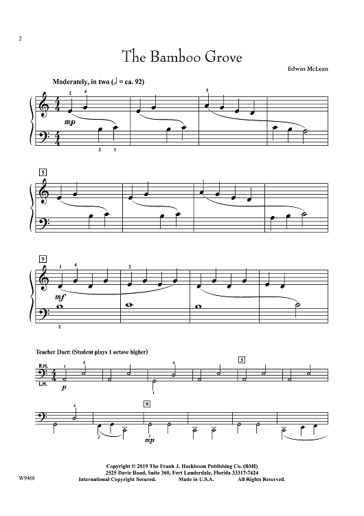 This piece evokes the peaceful tranquility of a Japanese bamboo grove. The beautiful flute-like melody in "almost Middle C position" sings softly. Bamboo Grove has a simple, flowing melody that's easy to teach, and hands stay in position. The simple optional teacher duet gives the piece an added depth.