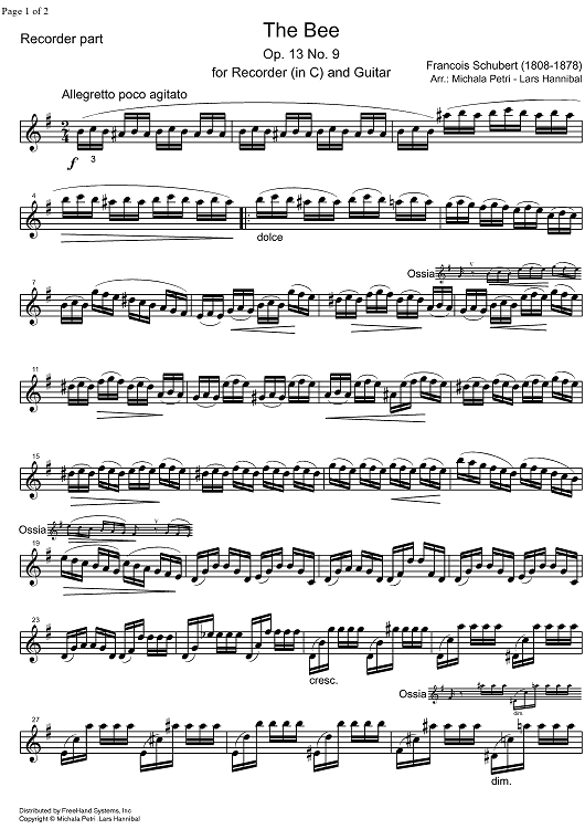 Digital Sheet Music for The Bee - Recorder by Franz Schubert, Lars Hannibal, Michala Petri scored for C Recorder/Guitar; id:321825