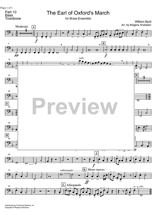 Digital Sheet Music for The Earl of Oxford's March - Bass Trombone by William Byrd, Mogens Andresen scored for Brass Ensemble; id:328248