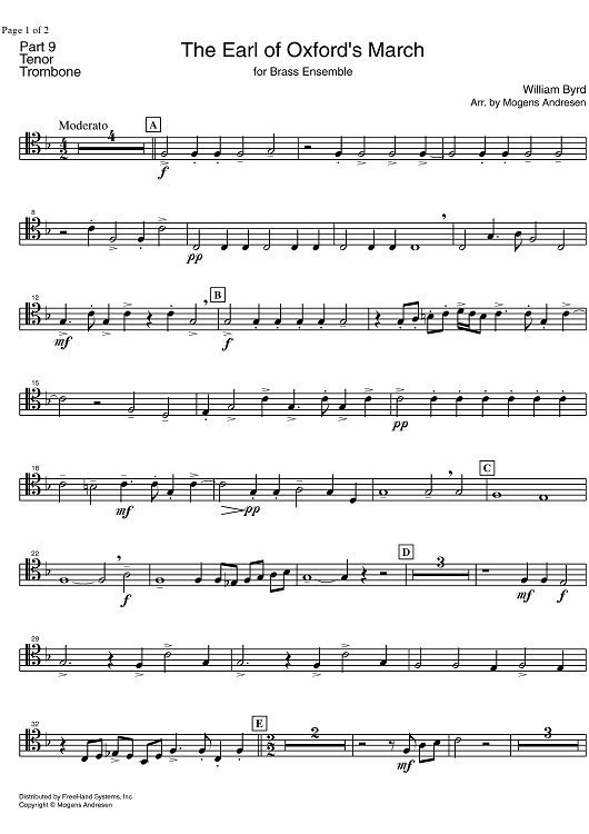 Digital Sheet Music for The Earl of Oxford's March - Tenor Trombone by William Byrd, Mogens Andresen scored for Brass Ensemble; id:328247