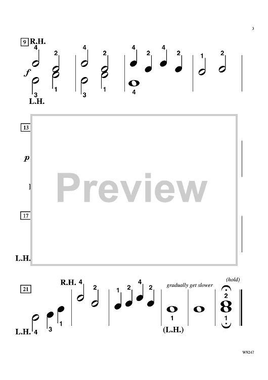 This pre-reading piece utilizes the black keys starting on the D flat just above middle C for the LH, with the RH extending to the E flat an octave above. Written in an ABA form, the B section contains hands-together playing for eight measures. This piece has a good variety of dynamics for your pre-reader to practice dynamic contrast, and contains a teacher accompaniment that contributes to the harmonic support of the student part. Both teacher and student will enjoy this enchanting piece.
