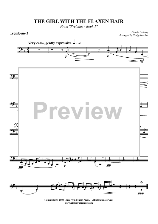Digital Sheet Music for The Girl with the Flaxen Hair - From "Preludes - Book 1" - Trombone 2 by Claude Debussy, Craig Kaucher scored for Brass Quartet; id:413919