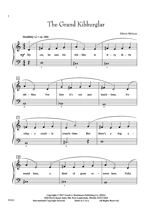 This is a good piece for students to learn D major and parallel minor. The witty lyrics tell the story of a little dog that is famous for stealing the cat’s kibbles! The music has an element of suspense, short phrases, and some use of pedal. There are accidentals but the hands stay in the same position for the most part.