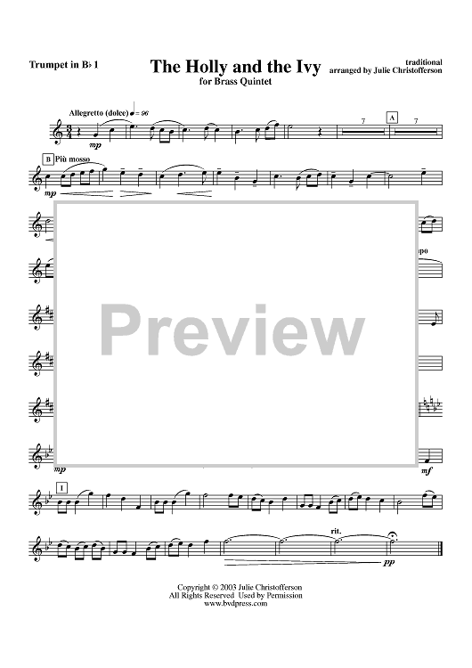 Digital Sheet Music for The Holly and the Ivy - Trumpet 1 by Julie Christofferson, Traditional scored for Brass Quintet; id:312919