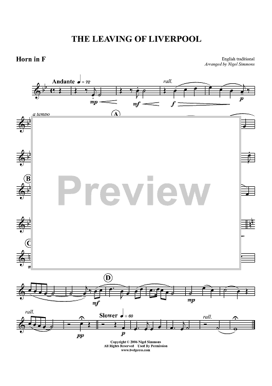 Digital Sheet Music for The Leaving of Liverpool - Horn in F by Nigel Simmons, English Traditional scored for Brass Quintet; id:428098