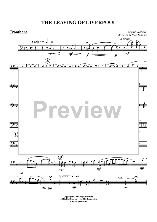 Digital Sheet Music for The Leaving of Liverpool - Trombone by Nigel Simmons, English Traditional scored for Brass Quintet; id:428099