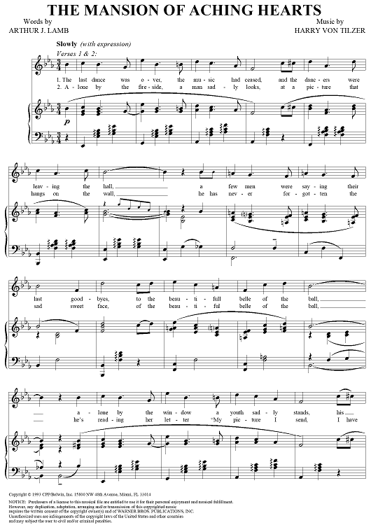 Digital Sheet Music for The Mansion of Aching Hearts by Harry Tilzer, Arthur J. Lamb scored for Piano/Vocal; id:264936
