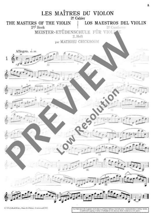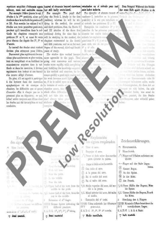 The masters of the violin have left us an inheritance of numerous books of remarkable studies and caprices. But the very abundance of this precious inheritance makes that an important part of it remains without profit, because it is impossible for the pupils to acquire or study these few thousands studies scattered in fifty big volumes. Very frequently, however, these studies are not classified in a progressive manner. Result of an inspiration which the pedagogical spirit could not always dominate or guide as it liked to, the first studies address themselves sometimes to the pupils who conjugate yet their first shifts with the most easy bow strokes, while the last are always of transcendent difficulty. Whatever be the chosen studies, once the first step is sourmounted, the pupils must do great efforts to realize imperfectly and in divided movements, difficulties which are beyond them. The result of this is: a considerable loss of time and sometimes even much discouragement. It follows at all events, that instead of practising fifty or sixty caprice studies in one year's time, the pupils can hardly study thirty. It is the desire to remedy these multiple inconveniences, that has incited us to realize the present work and in order to accomplish it to search in the greatest works of the masters, the elements the most apt to insure rapidly to the young violinists, the most complete mecanism of the left hand and bow. These exceedingly numerous and diverse elements chosen in the old editions, have been re-examined, fingered and sometimes the nuances (shades) set by us, with the most care and then classified by degrees from the second to the eight year of study in a progressive manner. These books of studies will not bear their fruits however, unless the work is regulated from the second to the fifth year of teaching, by a good method and appropriated exercises. The studies cannot in reality during this period, replace neither a method nor the exercises, they have to be con