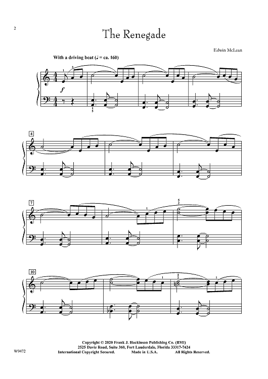 Imagine roaming free, under the Big Sky! This exciting, rhythmic adventure for your "renegade" student pianists is a perfectly compact piece with a driving beat and melody that has a western-feel. Students explore easy syncopations in left hand, pedaling, and brief hand crossings that end in a fun, pianistic finish.