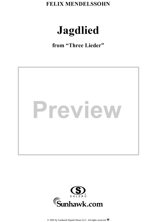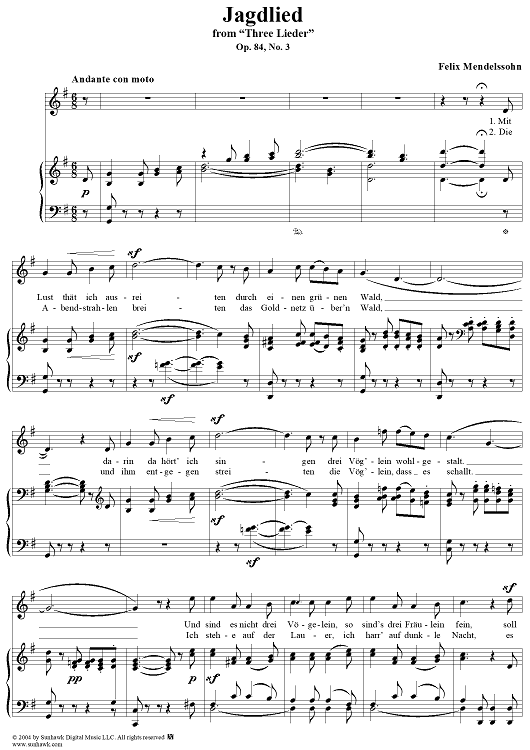 Digital Sheet Music for Three Lieder, Op. 84, No. 3: "A Hunter's Song" (Jagdlied) by Felix Mendelssohn scored for Voice/Piano; id:251868