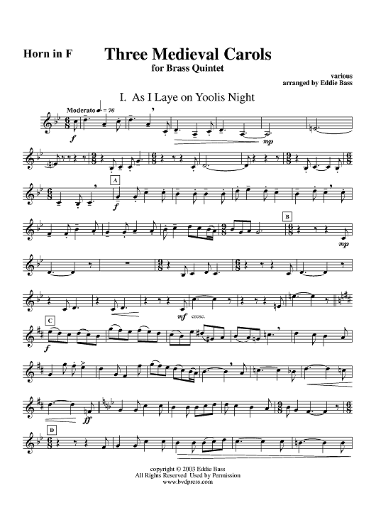 Digital Sheet Music for Three Medieval Carols - Horn in F by Various, Eddie Bass scored for Brass Quintet; id:319429