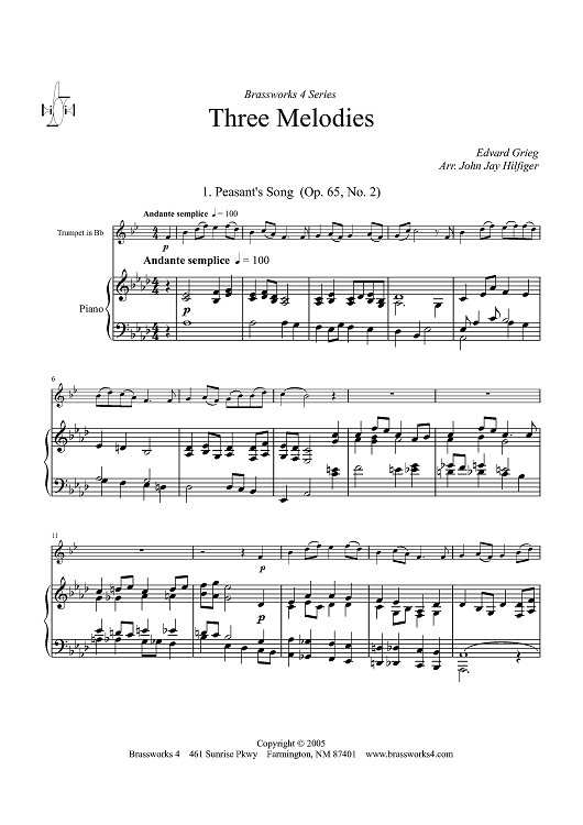 Digital Sheet Music for Three Melodies - Piano Score by Edvard Grieg, John Jay Hilfiger scored for Trumpet/Piano; id:357893