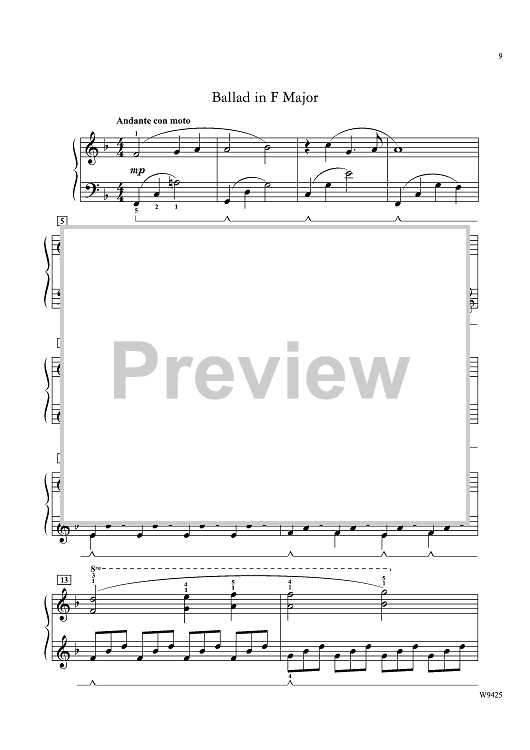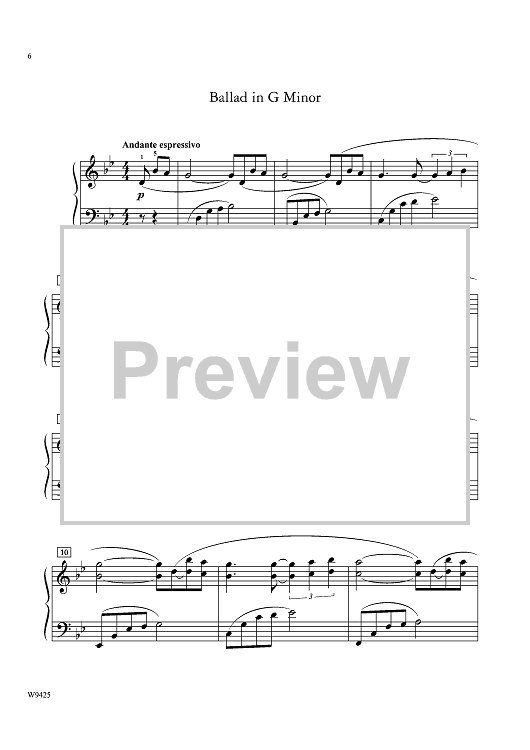 Ballad in D Major starts with short phrases using scale passages and harmonic intervals of a sixth as melodic components. Shorter note values appear in the middle section building to a chordal texture at the end. The next ballad in G minor, marked 'andante espressivo' employs extended L.H. arpeggios and some cross rhythms (2 vs 3). Ballad in F Major has frequent changes in register for the L.H. and the pulse varies from duplets to triplets in the accompaniment. Students will enjoy playing the beautiful melodies in these ballads that call for rubato and use of pedal.