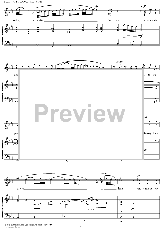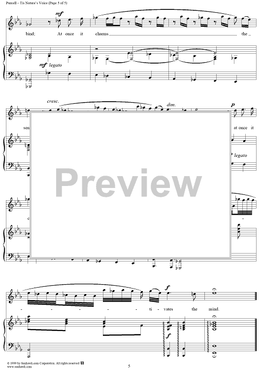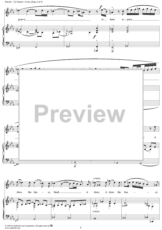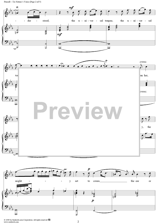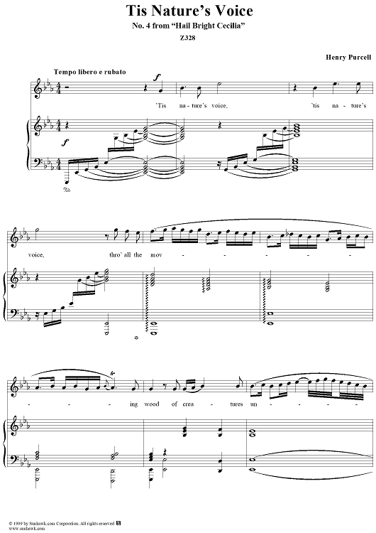 Digital Sheet Music for Tis Nature's Voice , No. 4 from Hail Bright Cecilia by Henry Purcell scored for Voice/Piano; id:255060