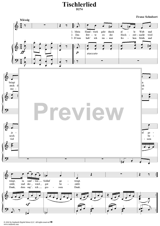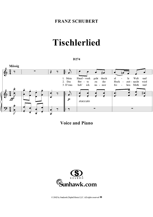 Digital Sheet Music for Tischlerlied, D274 by Franz Schubert scored for Voice/Piano; id:256629