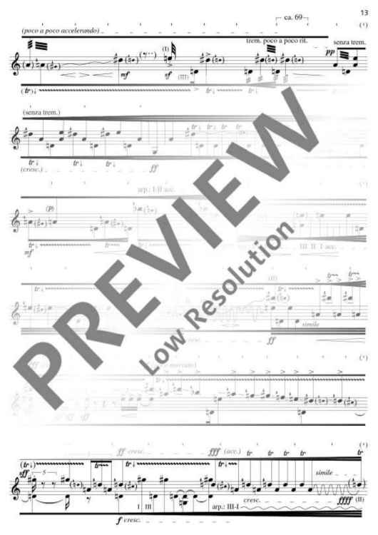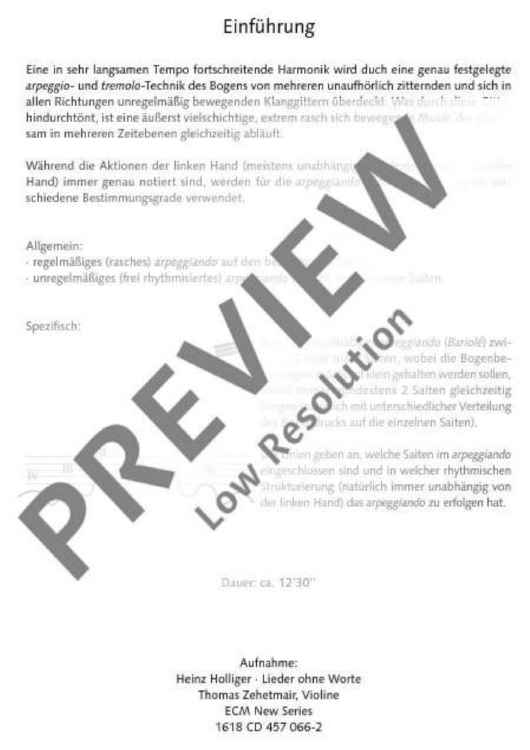 Geschrieben 1981 für die Malerin und Musikerin Rivka Golani, wurde das Werk 1981 im Rahmen von Musique Vivante, Paris, durch Rivka Golani, Viola, uraufgeführt. Eine in sehr langsamem Tempo fortschreitende Harmonik wird durch eine genau festgelegte arpeggio- und tremolo-Technik des Bogens von mehreren unaufhörlich zitternden und sich in allen Richtungen unregelmäßig bewegenden Klanggittern überdeckt. Was durch diese Gitter hindurch tönt, ist eine äußerst vielschichtige, extrem rasch sich bewegende Musik, die gleichzeitig abläuft. Es gibt auch eine Version des gleichen Werkes für Cello (1981). (H. Holliger)