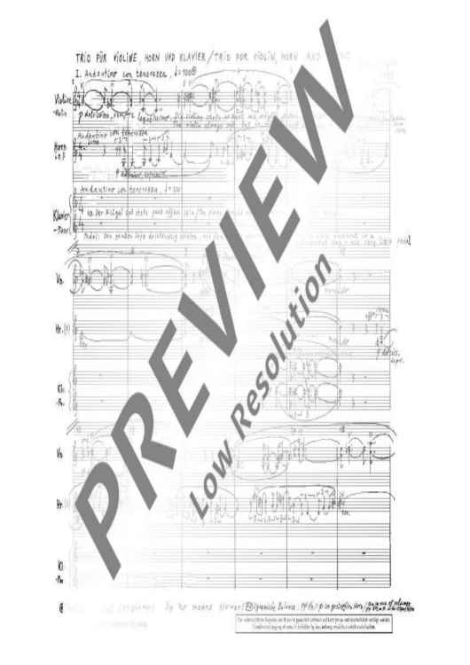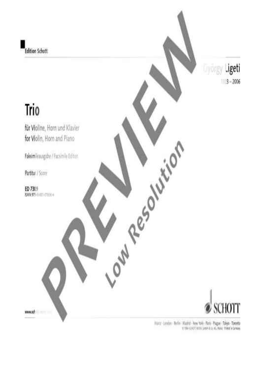 Im Hinblick auf einige später komponierte Werke kommt dem Horntrio, als "Hommage á Brahms" bezeichnet, eine Schlüsselfunktion zu. Spektakulär an diesem Werk ist, allgemein gesagt, die Arbeit mit prägnanten thematischen Gestalten und fest umrissenen Formen. Das Trio beginnt mit einem Zitat, aber in charakteristischer Verbiegung: die berühmten traditionellen "Hornquinten" aus Beethovens Sonate "Les Adieux". Ligeti macht sie zum Zentralthema seines Werkes, nicht nur im 1. Satz, sondern auch in einer zur Fünferfolge erweiterten Form, die das Thema der Schlusspassacaglia bildet.