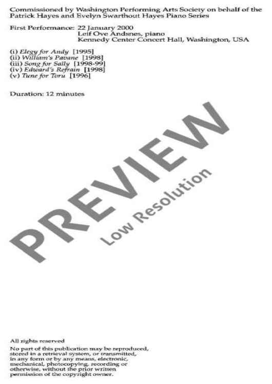 Commissioned by Washington Performing Arts Society for Leif Oves Andnes who gave the first performance. They are attractive and not too difficult, clearly stamped with Turnage`s lyrical style.