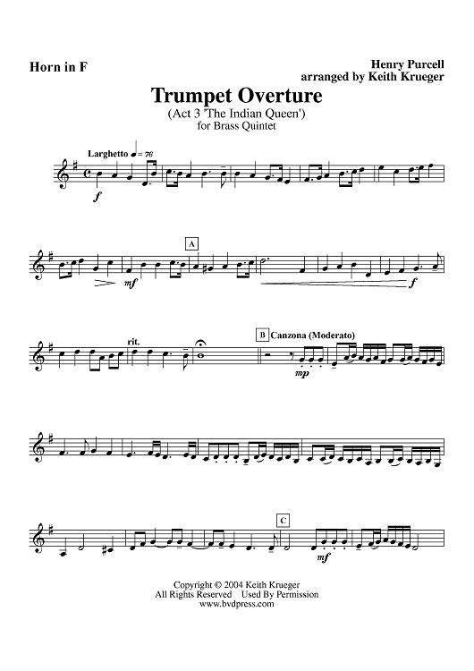 Digital Sheet Music for Trumpet Overture from "The Indian Queen," Act 3 - Horn by Henry Purcell, Keith Krueger scored for Brass Quintet; id:312437