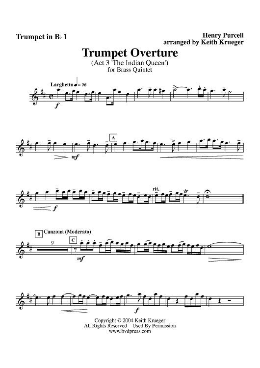 Digital Sheet Music for Trumpet Overture from "The Indian Queen," Act 3 - Trumpet 1 by Henry Purcell, Keith Krueger scored for Brass Quintet; id:312435