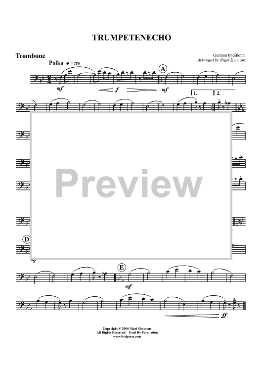 Digital Sheet Music for Trumpetenecho - Trombone by Nigel Simmons, Traditional German Melody scored for Brass Quintet; id:364249