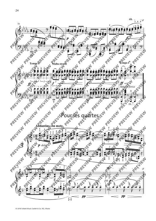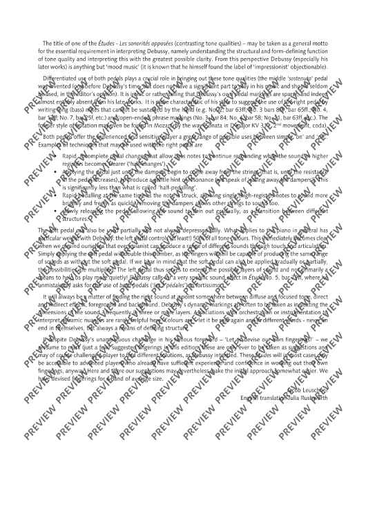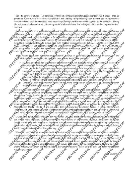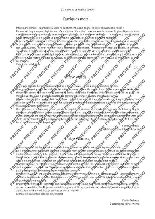 Building on the tradition of the piano study championed by Chopin, Liszt and Scriabin, Debussy composed his Douze Études in 1915, dedicated 'à la mémoire de Frédéric Chopin'. Each taking a small compositional element as a departure point ('five fingers', 'ornaments' or an interval such as the third or octave), they are really much more than studies, but rather extremely virtuosic character pieces in which all facets of Debussy's pianistic style are showcased. They represent his last significant contribution to the piano repertoire and are a true masterpiece of the genre. This Schott Essential Exercises edition includes a few words on the études from Claude Debussy himself, and a more detailed preface by Jacob Leuschner, including the history of the work and notes on performance.
