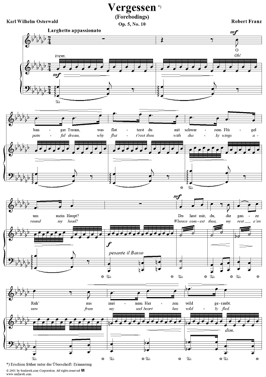 Digital Sheet Music for Twelve Songs, op. 5, no. 10: Forebodings (Vergessen) by Robert Franz, Karl Wilhelm Osterwald scored for Voice/Piano; id:269035