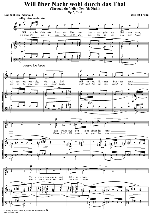 Digital Sheet Music for Twelve Songs, op. 5, no. 4: Through the Valley Now 'tis Night (Will über Nacht wohl durch das Thal) by Robert Franz, Karl Wilhelm Osterwald scored for Voice/Piano; id:268902