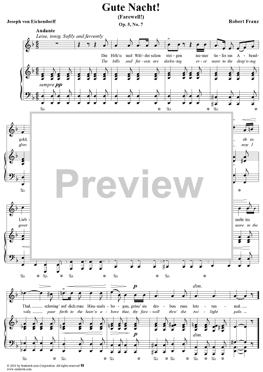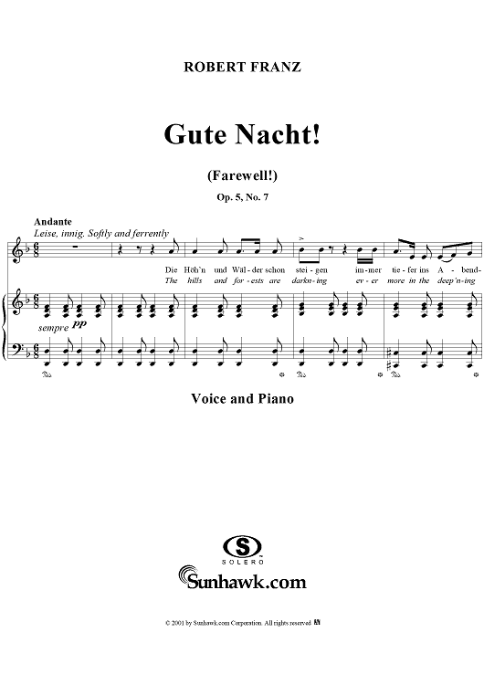 Digital Sheet Music for Twelve Songs, op. 5, no. 7: Farewell! (Gute Nacht!) by Joseph von Eichendorff, Robert Franz scored for Voice/Piano; id:269030