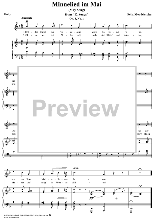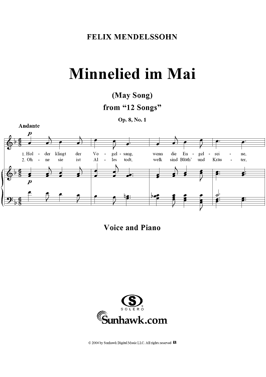 Digital Sheet Music for Twelve Songs, Op. 8, No. 1: "May Song" (Minnelied im Mai) by Felix Mendelssohn scored for Voice/Piano; id:252194