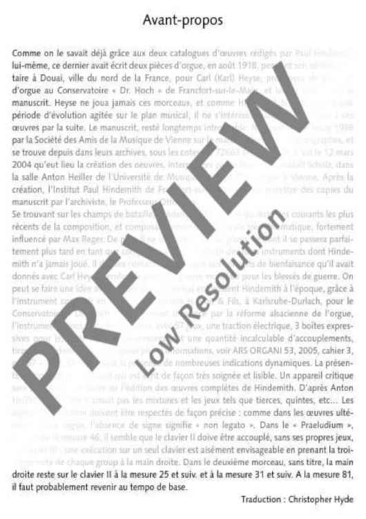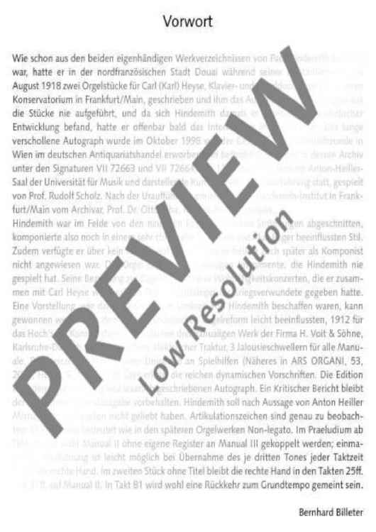 It is a small sensation that "Two Pieces", so far an unknown organ composition by Hindemith, can be published for the first time now. It consists of a prelude with fast and soft arpeggios, followed by a more peaceful movement with alternating homophonic and polyphonic chordal passages leading into a grandiose ending. Although the organ is one of the few instruments that Hindemith never played, his three sonatas and the two organ concertos are important repertoire pieces.