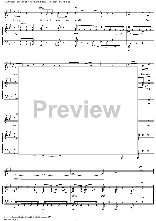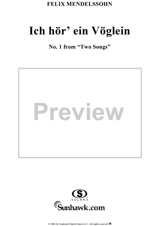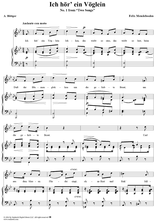 Digital Sheet Music for Two Songs, No. 1: "A Bird is Softly Calling" (Ich Hör Ein Vöglein Locken) by Felix Mendelssohn scored for Voice/Piano; id:251876